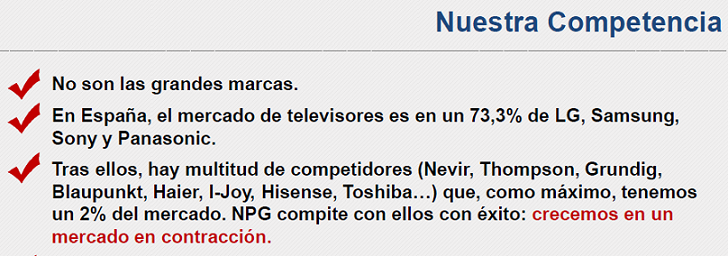 NPG cuenta en LATAM con un mercado excepcional debido tanto al apagón analógico, como también al desarrollo de los propios mercados emergentes. Sin embargo, NPG no posee una "imagen" o una "marca" clara de sus productos frente al consumidor.