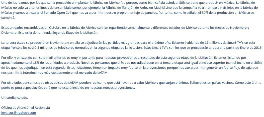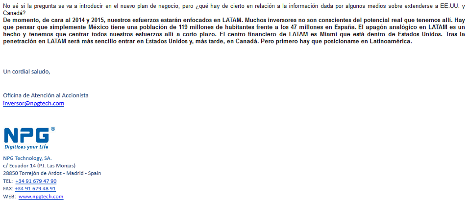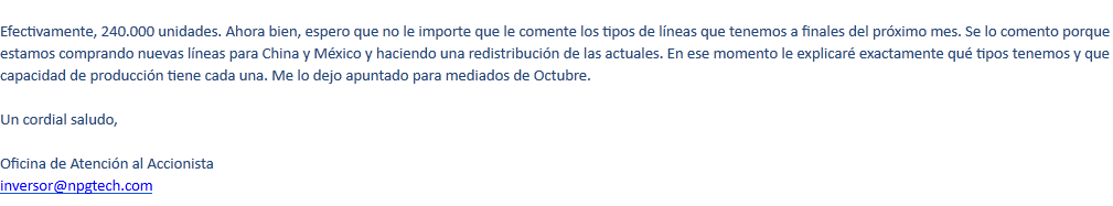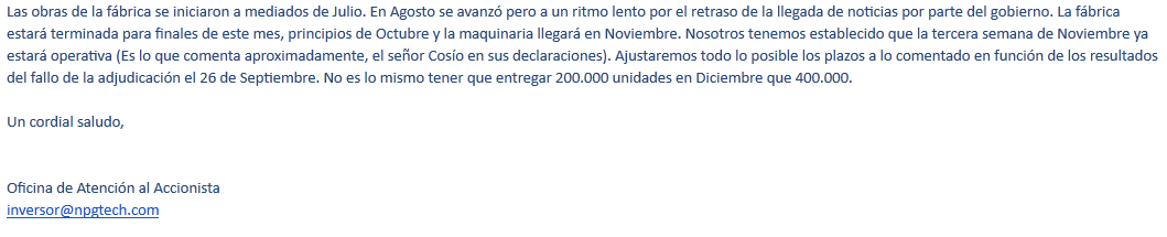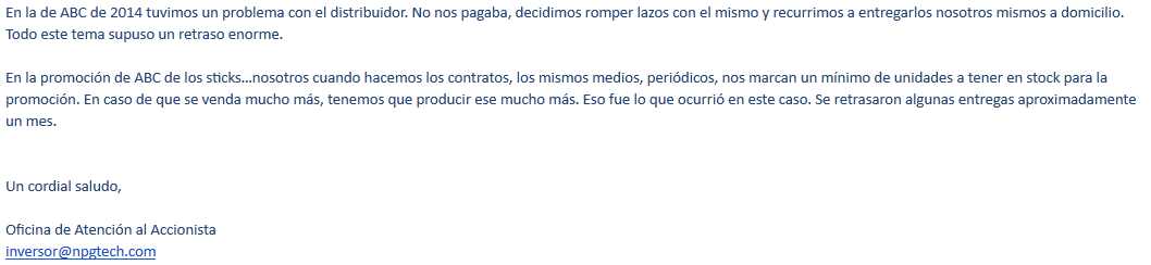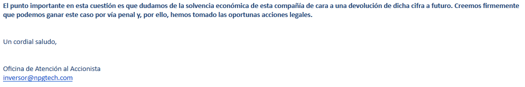 Por último, y siendo esto extremadamente importante, la empresa, NPG, ha mantenido un comportamiento correcto respecto al inversor en materia de información, dado que el propio inversor ha sido informado sobre la situación hasta en tres ocasiones en lo que va de año, por lo que no puede decir que no está informado sobre el mismo: