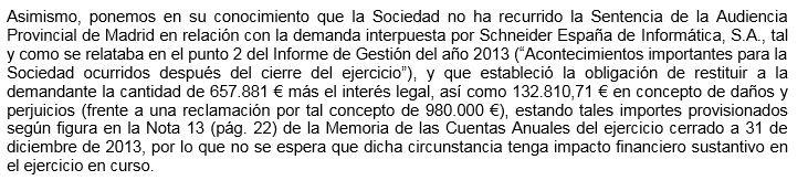 Como es lógico la información que puede dar la empresa sobre este punto es más bien escasa debido a ser un tema legal y judicial en mano de abogados.