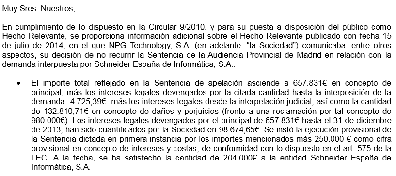 ...SEI únicamente ha conseguido embargar bienes líquidos por importe de 204.951,19 euros, lo que pone de manifiesto que NPG, al menos desde noviembre del 2013 (fecha en que se procedió al despacho de la ejecución frente a NPG) se encuentra en una situación patrimonial que le impide cumplir con sus obligaciones exigibles, presupuesto objetivo de la insolvencia previsto en el art. 2 de la Ley Concursal. "Comunicado de Schneider"