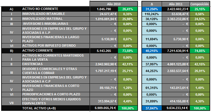 - La empresa ha doblado practicamente el tamaño de sus activos, y por tanto también el de sus pasivos, incrementándose desde el 2010 en un 96,67%. El principal contribuyente a este incremente ha sido el ANC que ha pasado del 26,41% a un 39% en la composición del activo total de la empresa.