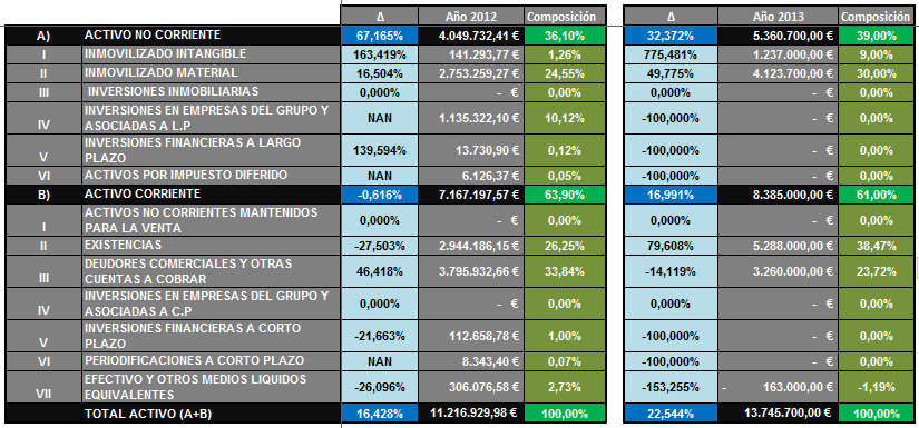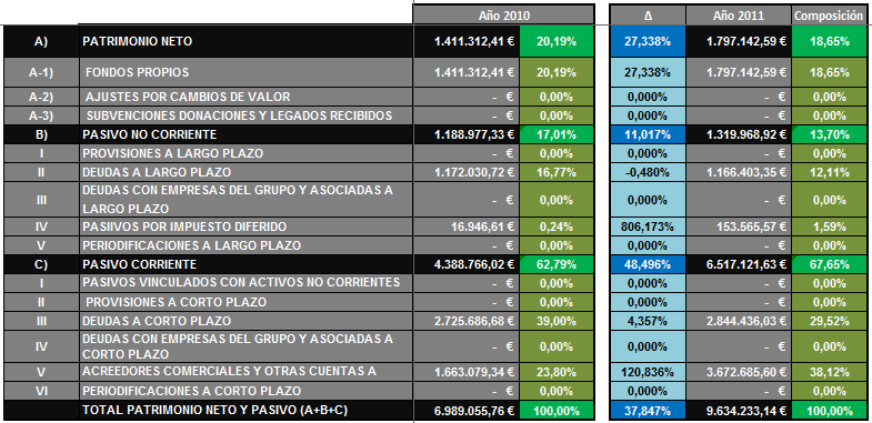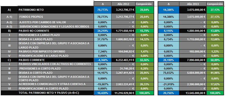 - Incremento del patrimonio neto en la composición del balance (de 20,19% a 27,13%) en detrimento del pasivo corriente (62,79% a 58,99) y el pasivo no corriente (17,01% a 13,88%), siendo el principal factor, tal y como ya se ha comentado, la fusión empresarial del año 2012, la cual afecta la partida de fondos propios.