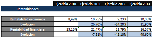 Ambas rentabilidades no han tenido una evolución positiva lo largo de los tres años anteriores al 2013 debido tanto al aumento del activo como del patrimonio neto. Este hecho es evidente en el año 2012 debido a la fusión empresarial de NPG que afecta a las dos partidas citadas (aumento del patrimonio neto en la rentabilidad financiera, e incremento del activo en la rentabilidad económica).