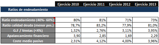 Los niveles de endeudamiento de la empresa son elevados, superiores al 60% de máximo establecido para este ratio. Esto no es de extrañar considerando que el patrimonio neto no alcanza el 40%-50% del pasivo total, por lo que la empresa está excesivamente endeudada. (Año 2013: PN=27,13%; PNC=13,88%; PC=58,99%- Nota: considerar que dichas cifras oficiales son anteriores a la salida al MAB)