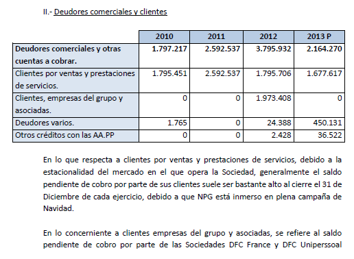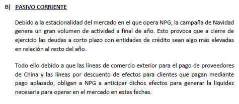 Esta excesiva deuda a final de año es debida a la campaña de navidad y a las líneas de comercio exterior que NPG posee en estas fechas, presentando un endeudamiento más elevado respecto al resto del año.