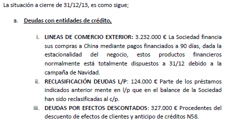 - El gran peso del pasivo corriente en la empresa, sobretodo las deudas a corto plazo del 2013, es debido a las líneas de comercio exterior utilizadas para el pago de proveedores en China como consecuencia del gran volumen de actividad generada a final de año por la campaña de navidad. (DIIM, pag 63 y 64). Hay que matizar que ciertas empresas (como NPG) debido a su actividad y al no tener acceso a los mercados bursátiles (previo al 2014) presentan un pasivo corriente elevado de forma genérica.