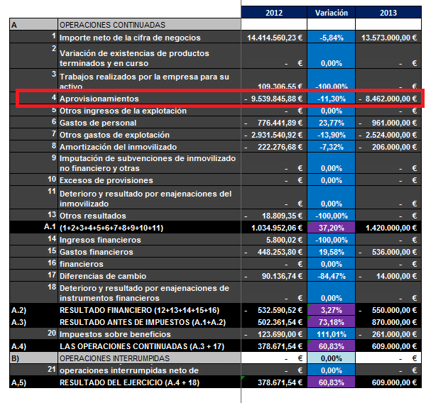 Por otro lado, y tal y como hemos comentado en el punto de la capacidad productiva, es muy interesante observar la reducción de la partida de "aprovisionamiento". Dicha reducción, a priori, puede deberse a la introducción de la fábrica de China y a la reducción de costes correspondientes.