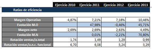 El año 2013 mejora significativamente debido al mejor beneficio neto de la compañía, pero tal y como podemos observar la rentabilidad financiera se comporta mejor que la rentabilidad económica ya que ésta última se ve afectada por las instalaciones técnicas de China en el activo.