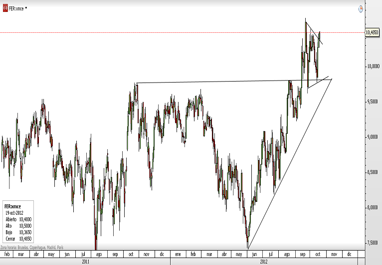 Desde el punto de vista técnico el CFD de Ferrovial tiene aspecto positivo al encontrarse en la parte alta del año y al haber consolidado durante un mes la zona de máximos en dos ondas. Por abajo tiene un soporte por la zona de 9.50 euros. El apoyo que hizo la semana pasada en la zona de 9.77 que coincide con los máximos del año pasado y mientras permanezca por encima de esa zona el valor debería proseguir su camino.