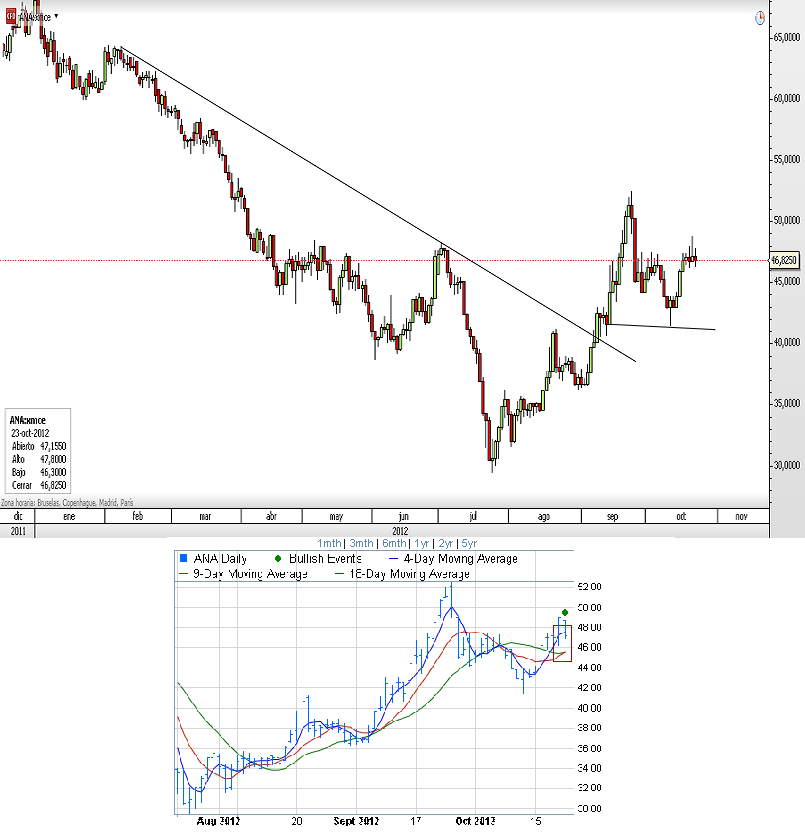 La cotización de Acciona se encuentra, al igual que la mayoría de activos del mercado Español, entre la media de 200 sesiones por arriba y las medias de corto plazo por abajo. El indicador de medias de 4, 9 y 18 sesiones acaba de dar una señal de compra al cruzar hacia arriba la media de 9 sesiones a la de 18 quedando las más sensibles por arriba pero estando la más tendencial (200 sesiones) en gráfico diario todavía por encima (47.50) lo que frena un poco la escalada.