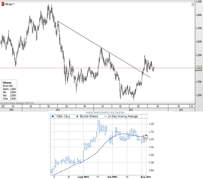 Ayer se produjo una señal alcista en Tubacex al cruzar el precio al alza la media de 21 sesiones como muestra el gráfico de más abajo. Esta mañana nos encontramos al valor cotizando por debajo de ella dejándose cerca del 1% y es que aunque se encuentra por encima de la resistencia de este veranos, tendremos que verle superar la media y cerrar por encima para que dé una señal más fiable que haga pensar que puede continuar con su escalada.