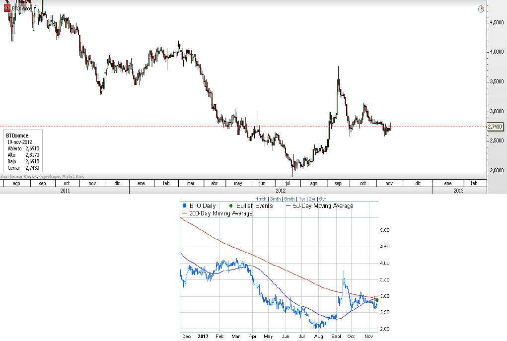 A media mañana el valor sube más de un un punto porcentual y parece que quiere volver a subir después del fuerte impulso visto desde los mínimos del mes de agosto. Consolidar bien la zona y alcanzar los 3 euros por título daría un cambio de visión generalizada al superar el precio la media de 200 sesiones.