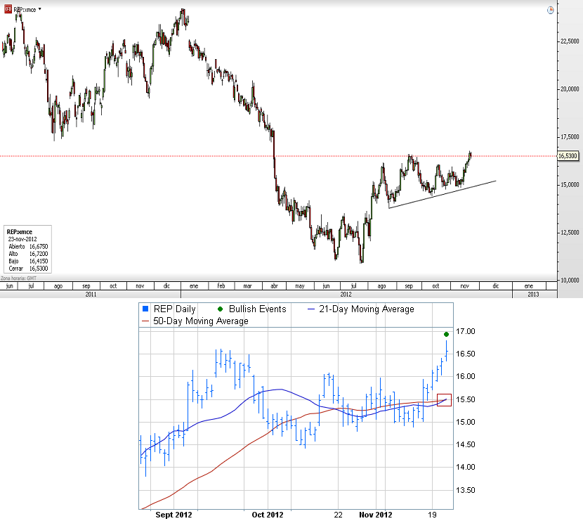 Entre las numerosas señales que venimos destacando últimamente en Repsol, hoy destacamos la última que se ha generado al cruzarse las medias de 21 y 50 sesiones. El valor se encuentra en los máximos desde verano y a punto de anular la bajada que sufrió tras la expropiación de YPF. Por fundamentales el valor genera ya más ingresos que los que generaban ambas compañías cuando eran una por lo que los niveles actuales podrían estar lejos de su valor teórico real. En la zona de mínimos después del impulso del verano encontramos un soporte que ni se ha molestado en testear.