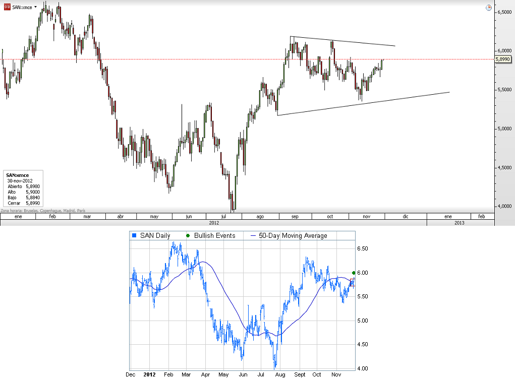 La cotización de Banco Santander ayer impulsó con fuerza dejando atrás la media diaria de 50 sesiones tras varias sesiones consolidando alrededor de ella. Queda por ver si continuará la tendencia y superará la zona clave de los seis euros para dejarla atrás y si saldrá por fin del rango en el que lleva desde hace más de dos meses. Ya que el rango cada vez es más estrecho, desplazándose entre los 5.50 y 6 euros. La zona de peligro estaría por debajo de los mínimos de este mes aunque de momento no parece correr peligro pero será la media de 50 sesiones la que actúe de soporte en los próximos días.