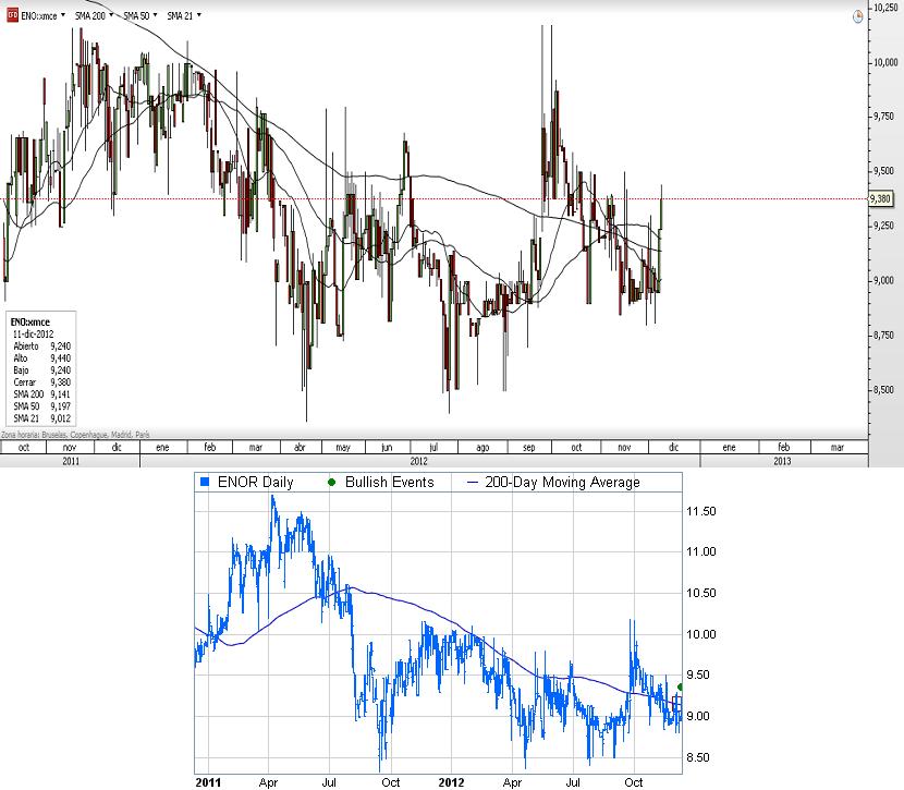 La cotización de Elecnor cerró ayer por encima de las medias de largo plazo, estando por encima de la de 200, 50 y 21 sesiones que podría empujar al alza el valor aunque sea un valor estrecho podría ayudarle a recuperar el terreno positivo de cara a cerrar este ejercicio 2012. Al ser un valor con poca liquidez en el mercado pensar en entrar con una buena entrada y si el valor se encuentra por encima de los 9.50 euros a cierre de varias sesiones le daría paso a ir a por los máximos anuales.