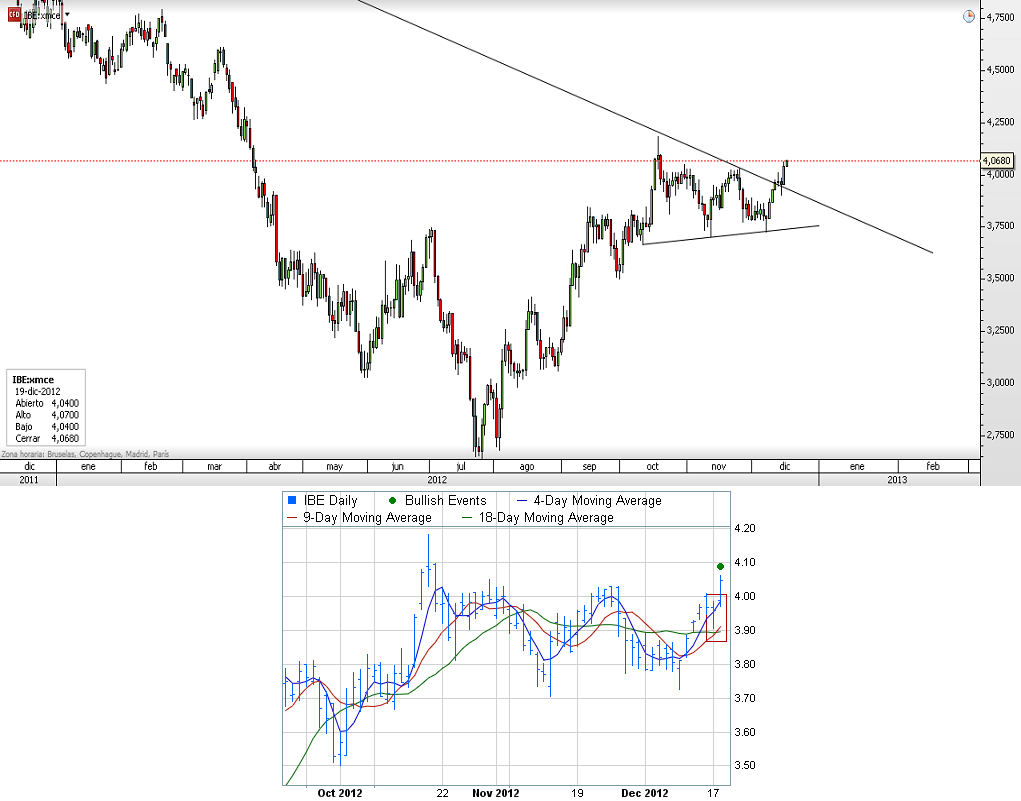 Durante los últimos dos meses venimos comentando las numerosas señales alcistas que está generando la cotización de Iberdrola. Desde el cruce la media de 200 sesiones el día 16 de octubre pasando por varios cruces de la de 50 sesiones. Hoy tenemos uno todavía más llamativo ya que coincide un triple cruce de medias de corto plazo (4, 9 y 18 sesiones) con la superación de la directriz principal bajista que viene desde el 2008. El cruce de medias se ha generado cuando la media de 9 sesiones ha cruzada a la de 18 sesiones estando las tres en posición alcista. Pero lo que más importa de esta señal es que se produce con la superación de la directriz principal que da lugar a un cambio de tendencia en largo plazo y que deberá mantenerse en el tiempo para que se confirme el cambio. Por la parte de abajo tenemos el soporte en los mínimos de octubre, noviembre y diciembre.