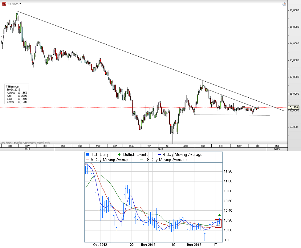 La cotización de Telefónica está inversa en un desplazamiento lateral que le está llevando a ser la gran rezagada de los blue chips de Ibex 35 ya que la mayoría de valores se encuentran ya por encima de los máximos de verano. En el corto plazo se ha generado una señal positiva al cruzar la media de las últimas 9 sesiones a la de 18 sesiones que podría darle la vuelva al lateral y comenzar a desplazarse hacia arriba. Aunque el valor se encuentra por debajo de la resistencia principal, ha conseguido superar una previa que viene desde verano. Lo cierto es que se está viendo un gran volumen estos últimos días atrás ya sea por aplicaciones o por volumen normal que puede ser debido a los planes de remuneración de empleados mediante opciones de compra sobre el valor. En la parte baja hemos visto como cada vez que el precio caía a la zona de los 9.75 euros, rebotaba y volvía a colocarse por encima de los 10 euros pero sin gran fuerza, así que, en los mínimos de los últimos tres meses estaría en soporte principal.