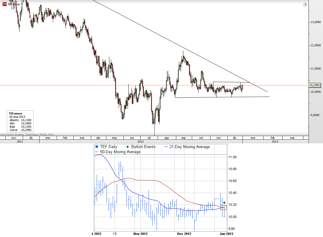 El último día del año 2012 se produjo una señal de compra significativa en Telefónica ya que la media de las últimas 21 sesiones y la de las últimas 50 sesiones se han cruzado dejando a la de 21 por encima de la otra. Ya van cuatro meses de lateral donde cada vez que el precio cae por debajo de los 10 euros, vuelve a remontar pero sin ninguna fuerza. Ahora también tenemos una zona de máximos bien acotada en los 10.42 euros que coincide con los máximos de principios de octubre y de finales de diciembre. Si esa zona es superada al alza podría abrir una vía de recuperación para ir a atacar la resistencia principal y así propiciar un cambio de tendencia en un valor rezagado respecto a los otros 34 valores del Ibex.