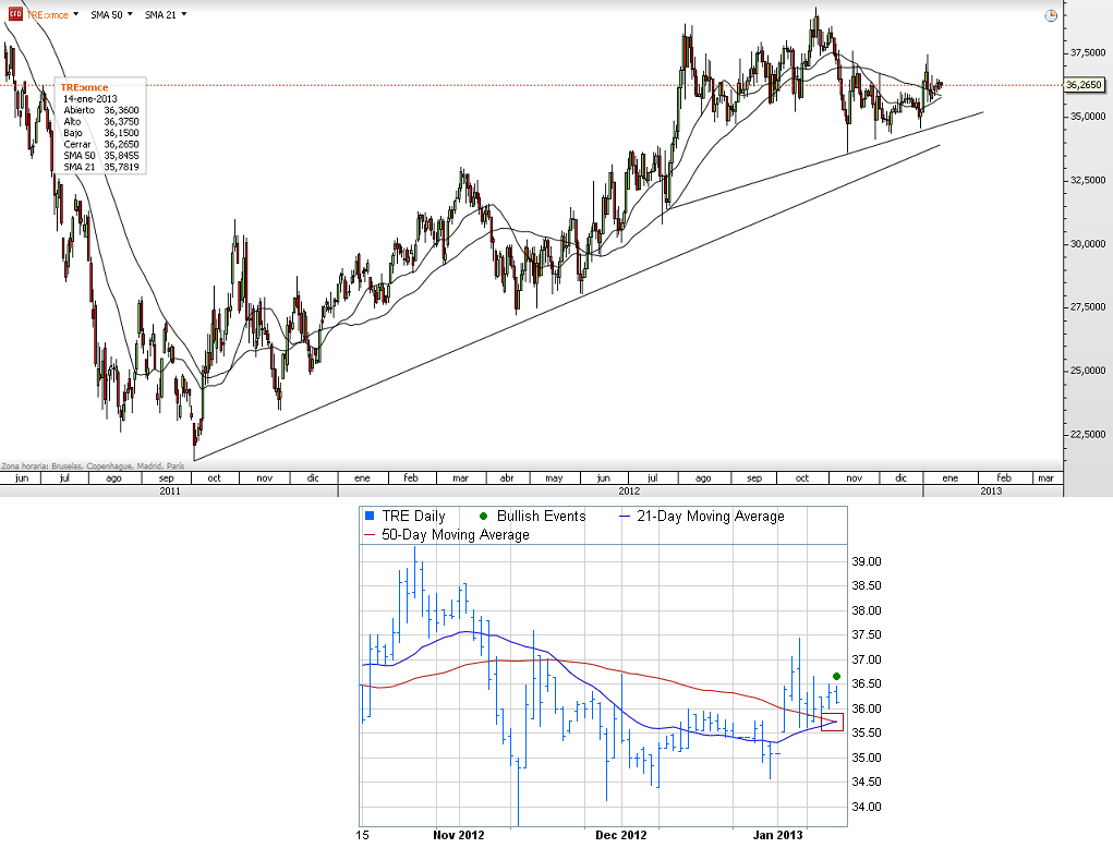 La semana pasada comentábamos cómo se produjo una señal alcista en la cotización de Técnicas Reunidas al cruzar el precio al alza la media de las últimas 50 sesiones y ahora mismo se está produciendo otra de carácter positivo ya que es ahora la media de 21 sesiones la que está cruzando a la de 50 marcando una potencial salida al alza. Para ello, el precio tiene que aguantar por encima de la media de 50 sesiones y saltar por encima de los máximos de enero que los tiene situados en 37.45 euros ya que si éste es superado, los máximos del año pasado serían fácilmente rebasados. Por abajo, el soporte no cambia, está situado en 34.45 y un poco más abajo tenemos la directriz alcista principal.