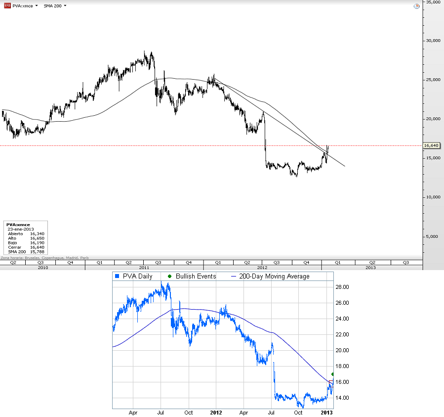 En este ejercicio 2013 Pescanova está siendo uno de esos valores que sube ya más de un 20% y que está generando señales de compra al superar de forma clara la resistencia. Con el impulso de ayer, el valor se anota ya un 7% de subida en la semana y es que en la apertura de ayer, su cotización superó la media de las últimas 200 sesiones haciéndole subir con fuerza. Para buscar un punto de entrada, tendríamos que esperar a que el precio vuelva a contactar la media de 200 y así asumir menos riesgo en la entrada ya que una leve corrección podría darse en el corto plazo. Aunque como objetivo nos fijaremos en los mínimos del segundo trimestre del año pasado y como soporte, el precio de apertura de este 2013 en 13.90.