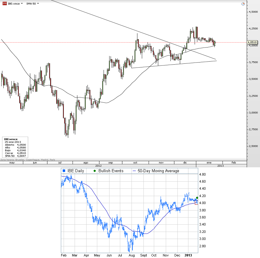 Tras finalizar la ampliación de capital por el pago del dividendo, la cotización de Iberdrola ha cedido posiciones de manera muy tímida para ir a apoyarse sobre la media de las últimas 50 sesiones en gráfico diario y rebotar con fuerza tras ese apoyo técnico. Hoy le vemos retroceder una 0.5% hasta los 4.05 euros y queda a la espera de los datos ifo alemán a las 10 de la mañana y un poco más tarde a las 12:00 horas sobre el dato de devoluciones del LTRO. Mientras el valor permanezca por encima de la directriz bajista y por encima del soporte de los 3.75 euros, mantiene el tono alcista que podría saltar si el máximo de ayer es superado y las noticias macro salen buenas.