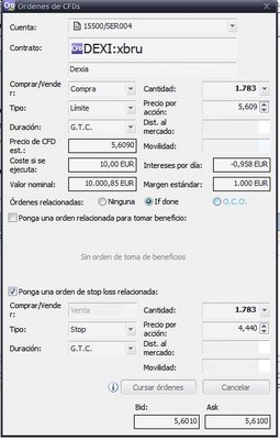Vamos a comenzar nuestras estrategias entrando largos (apostando al alza en Dexia). Se trata de una operación con bastante riesgo dada la volatilidad que ha tenido este valor en los últimos meses pero que me ha parecido interesante.