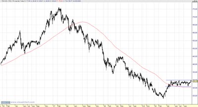 En la actualidad, se encuentra en un claro movimiento lateral por encima de su media móvil de 200 sesiones y enfrentándose desde hace varios meses con la fuerte resistencia que posee en los 30 euros.