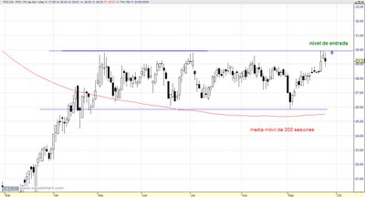 Creemos que puede ser una buena oportunidad de compra si supera los 30 euros, el stop lo vamos a colocar por debajo de su soporte de los 26 euros, concretamente en 25,56 euros. No obstante, si se activase esta estrategia nuestra intención es ir subiendo el stop progresivamente (lo iremos indicando en las opiniones de esta misma entrada).