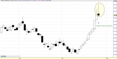 Ayer dejó una vela en forma de estrella (Shooting Star) que puede ser un síntoma de cansancio, al menos en el corto plazo. Por precaución decidimos subir el stop a los 22,86 euros para dejarlo justo debajo del último hueco alcista que dejó Randstad en su subida.