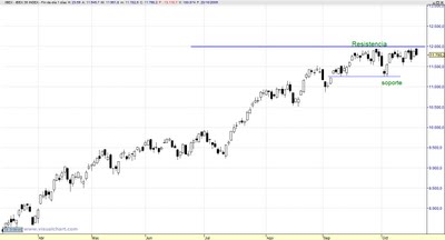 Podríamos realizar una estrategia apostando por la ruptura de la resistencia comentada. Para ello podríamos utilizar los CFDs que nos ofrece Clicktrade para operar en el Ibex 35. Podríamos colocar una orden de compra a stop en 11.974 y si ésta se hace podríamos colocar nuestro stop de protección en los 11.170 puntos, debajo del soporte de corto plazo y del hueco alcista que dejó el Ibex a principios de Septiembre.