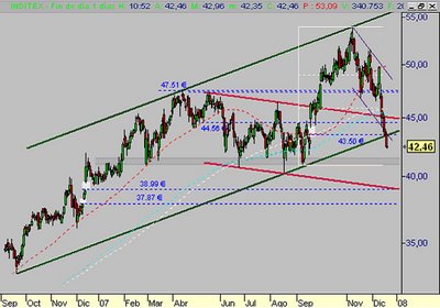 Con esta situación técnica y en el entorno actual de mercado tan incierto que tenemos, pensamos que serían las recuperaciones las que deberían de imponerse más que la continuidad de las correcciones. No obstante y de cara a operativa, si los 43,50 € no fuese recuperados en breve, el escenario más probable sería ver caídas hacia la zona de control y soporte gris e incluso dilataciones ya más peligrosas sobre los 38,99/37,87 €, zonas que son de cobertura de sendos gaps alcistas que aún permanecen abiertos.