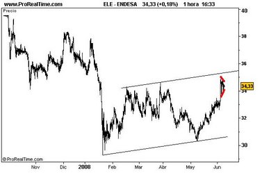 - Venta al alcanzar los 33.90 que supondrían la pérdida del soporte de la cuña que se ha formado en las últimas sesiones. En ese caso, el stop inicial estaría colocado en 34.80, para el intento de repetir la operación en el techo del canal.