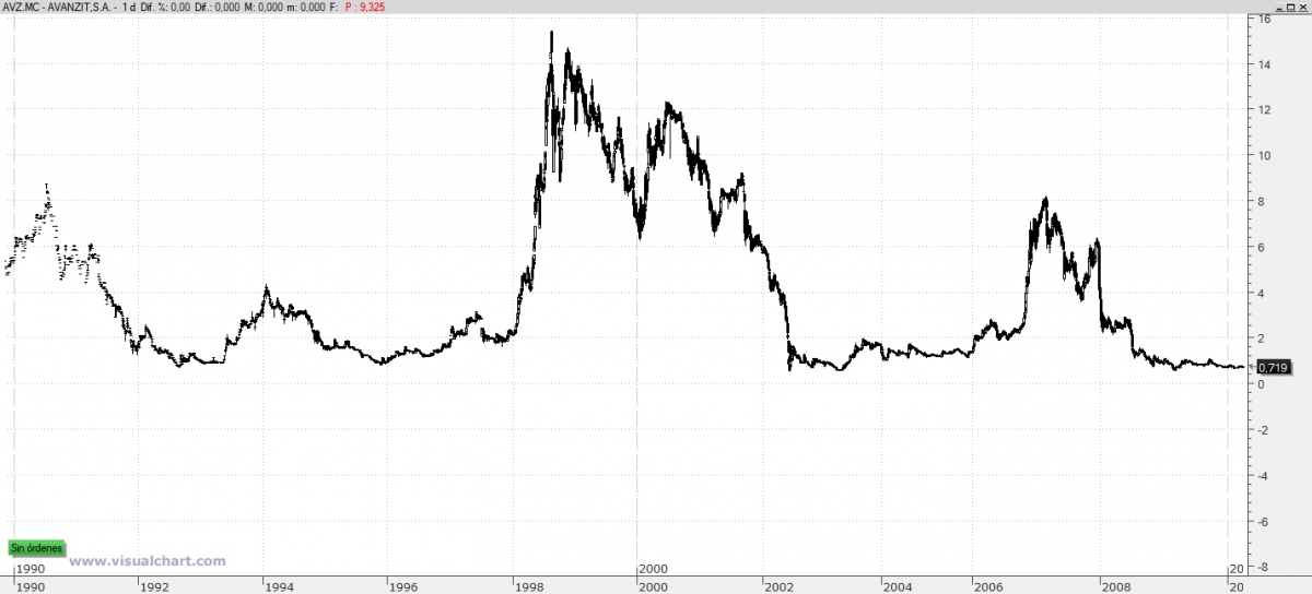 Avanzit ha sido un valor tradicionalmente manipulado en Bolsa y que ha tenido algunas subidas y bajadas estratosféricas en su evolución bursátil. Actualmente se encuentra en una fase de tendencia bajista tanto en el largo como en el medio y el corto plazo.