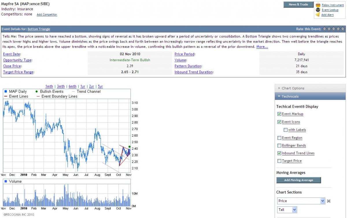 Destacamos la figura triangularalcista que según nuestro indicador en la plataforma ClickGlobal Trader indica que la acciónpodría llegar hasta los 2.65 – 2.71 euros. Se puede observar como ese nivel coincide con el máximo de julio.