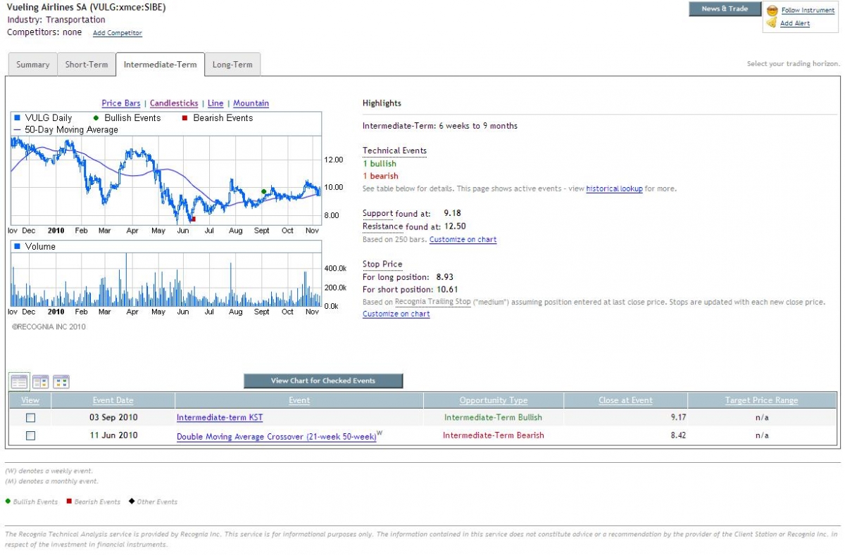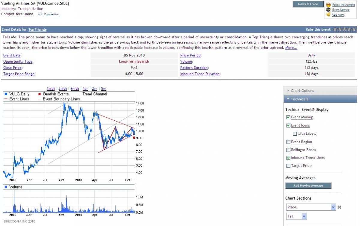 Es interesante el gráfico ya que tiene oportunidades de trading alcistas como bajistas. Por un lado las medias móviles indican que el precio irá a romper los máximos de Octubre y Julio. Ambos niveles son muy claves para ver cotizar la compañía aérea en los 11 euros. Por otro lado, ha formado una figura triangular bajista que podría ser interpretada como un pequeño doble techo. En definitiva, si se mantiene la tendencia alcista desde los mínimos de 2010 el precio buscará los 11.00 con objetivo a largo plazo en el techo anual. En caso contrario, los 9.00 serán un hecho.