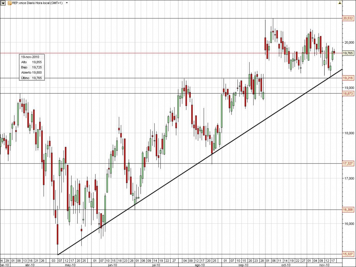 Nuestra plataforma ClickGlobal Trader nos muestra que el precio del CFD de Respol se mantiene en una tendencia alcista desde el mínimo que marcó en mayo de 2010. El objetivo a largo es el máximo del mes pasado y a la baja se debería de perder el soporte de los 19,21 euros. Además, hay que mirar que las Medias Móviles de 50 días están actuando de soporte.
