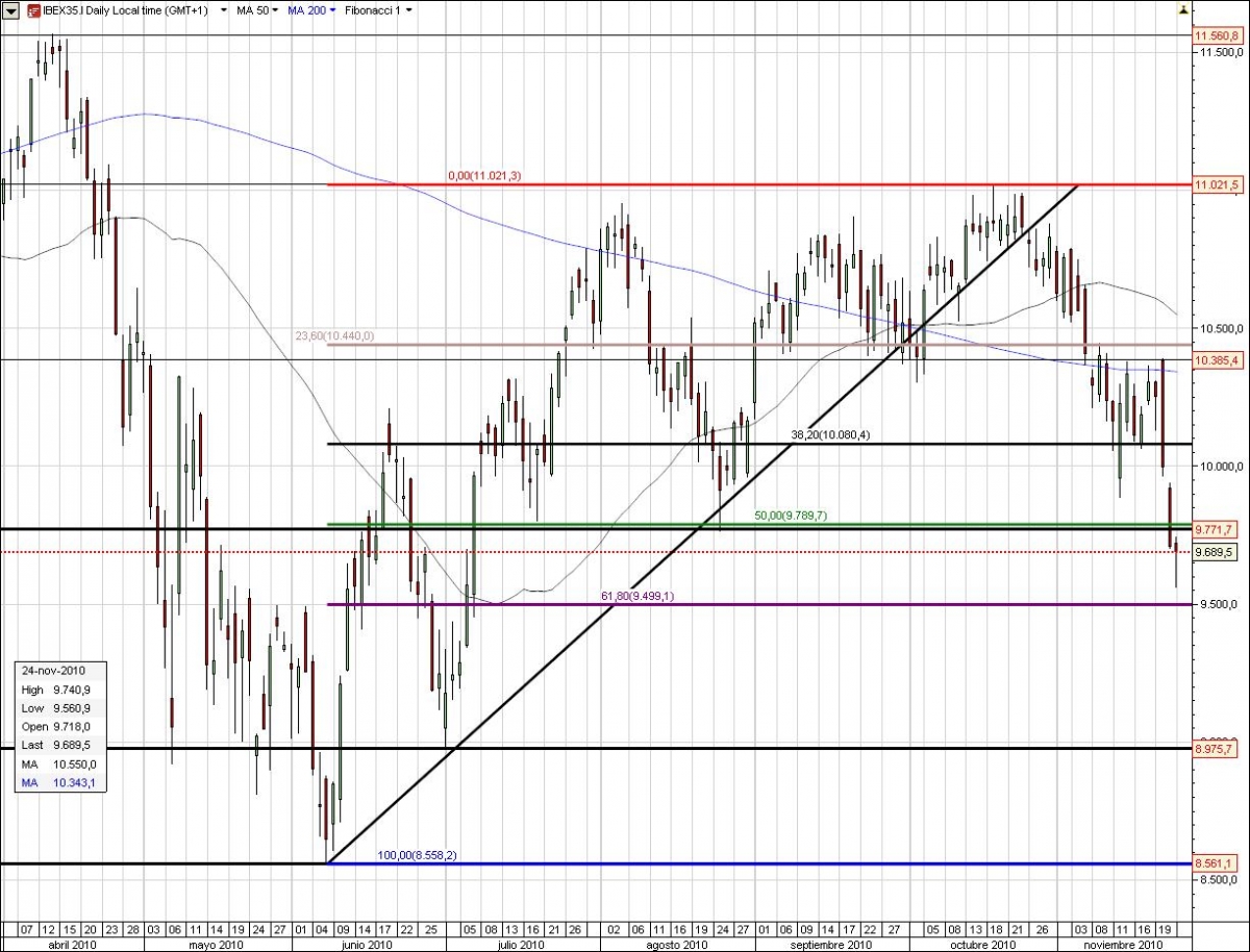 El gráfico del CFD del Ibex-35 ha perdido el soporte que marcaba el mínimo de agosto de 2010 que estaba junto al fibo 50 trazado desde el mínimo de junio hasta el máximo de octubre. En definitiva, un nivel muy importante que abre las puertas a pensar que el selectivo español podría buscar los 9500 puntos. En este nivel se encuentra el 61,8% de los retrocesos de fibonacci. Habrá que estar muy atentos a como evoluciona los problemas de las deudas periféricas ya que está claro que es un movimiento de sentimiento negativo de mercado.