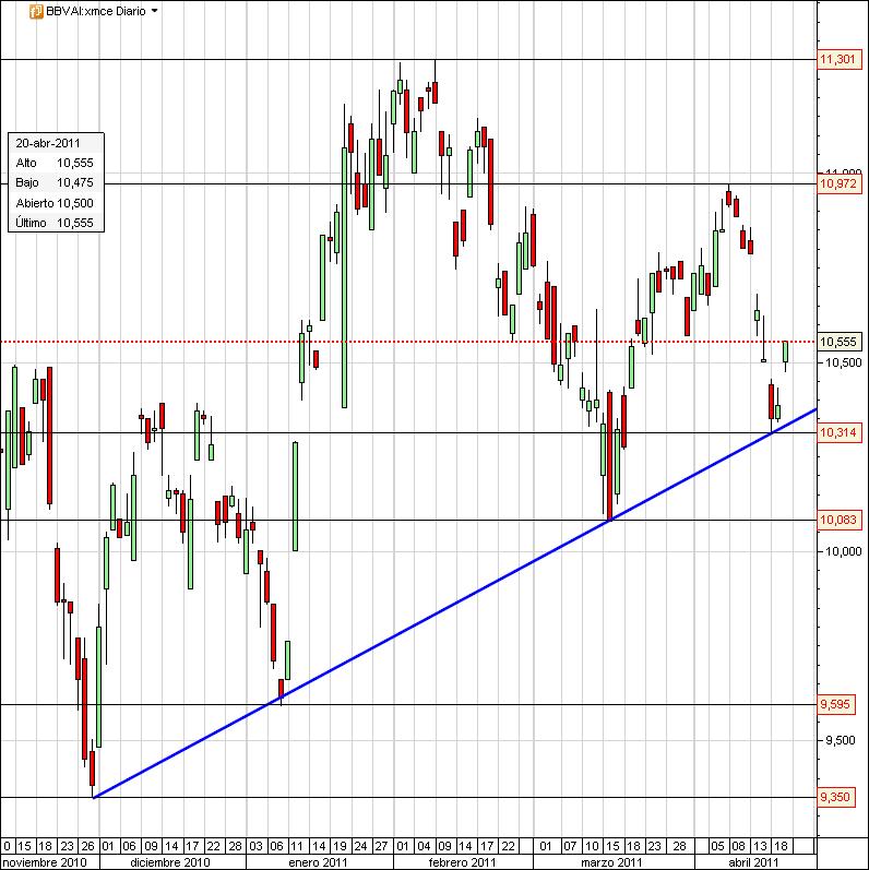 El ETF que replica al IBEX-35 tiene un gráfico muy interesante. Observando la tendencia alcista que está dibujando desde el mínimo de noviembre de 2010 parece que podría seguir así. El primer objetivo alcista está situado en los 11 antes de volver hasta los 11.30, que es el máximo de febrero de 2011.