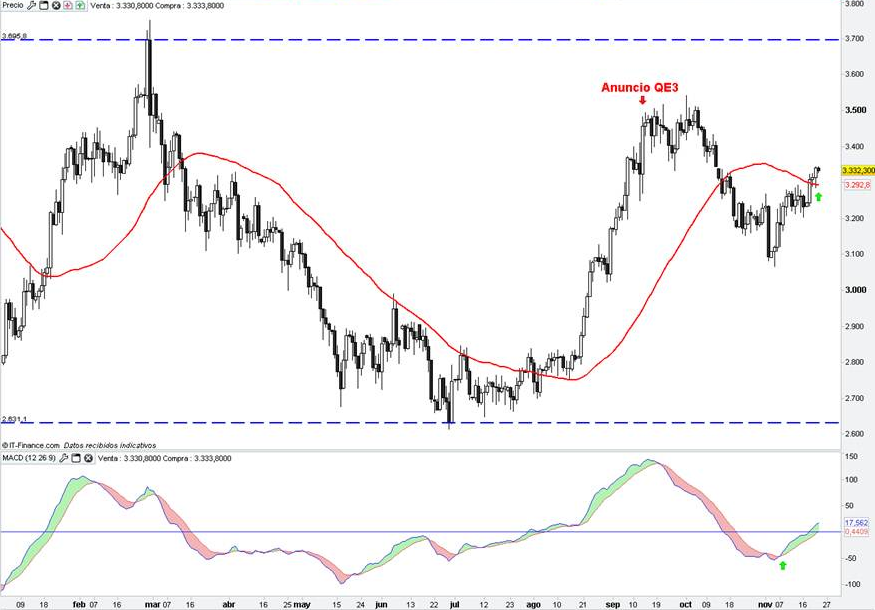 Sin embargo, la Plata está en una situación técnica claramente alcista. EL MACD se cruzó al alza el pasado 7 de noviembre, y recientemente, la cotización ha traspasado la media de 50 días.