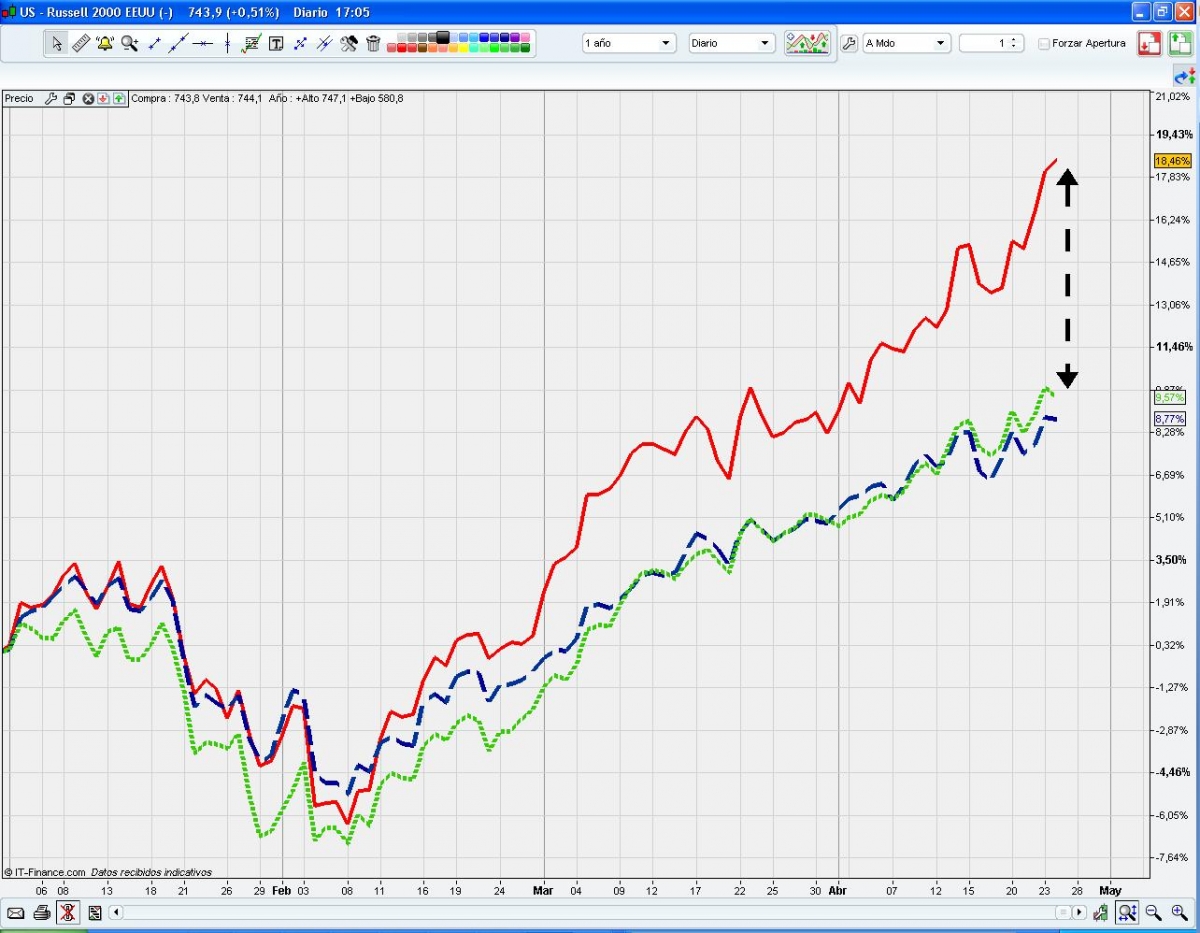 En Rojo, el Russell 2000. En Verde, el Nasdaq Composite. En Azul, el SP500.