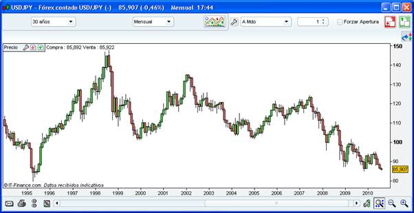 El mercado de forex es de los mercados más líquidos que existen y donde, además, se nos da la posibilidad de hacer trading 24h al día pues el mercado no descansa. Las divisas fluctúan siendo sensibles a la situación económica de cada país. De este modo, la ralentización de la economía estadounidense anunciada por el mismo presidente de la Fed, Ben Bernanke, y corroborada por los malos datos macroeconómicos de las últimas semanas, se ha visto reflejada en su moneda. El dólar ha perdido fuerza desde el mes de junio y esto se hace notar de manera más aguda frente a divisas que, por el contrario, están ganando peso. Este es el caso del cruce dólar americano frente al Yen japonés. Mientras el billete verde comenzara a descender el Yen, que tradicionalmente se ha usado como moneda refugio, ha sufrido una revalorización importante lo que sitúa el cruce entre ambas en los 85,92, niveles que exceptuando en noviembre de 2009, no se veían desde 1995.