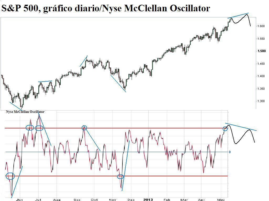En el gráfico aparece el S&P 500 y el Nyse McClellan Oscillator. Cada vez que el índice supera la línea horizontal de arriba, el S&P entra en sobrecompra. Cada vez que perfora la línea horizontal de abajo, el S&P entra en sobreventa. Una vez que eso ha ocurrido, se ha dibujado posteriormente una divergencia (alcista o bajista) entre el índice y el indicador.