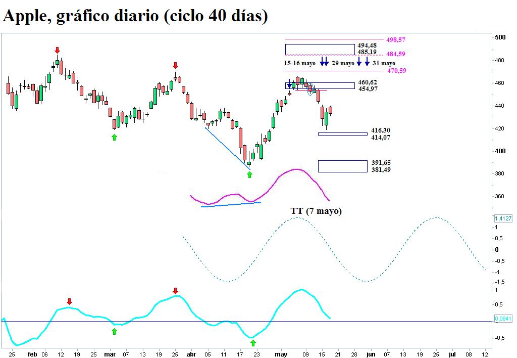 Certificada la precisón de mi anterior informe, vuelvo a enfocar hoy mi atención hacia la empresa de la manzana para ver en qué situación se encuentra su ciclo de 40 días.