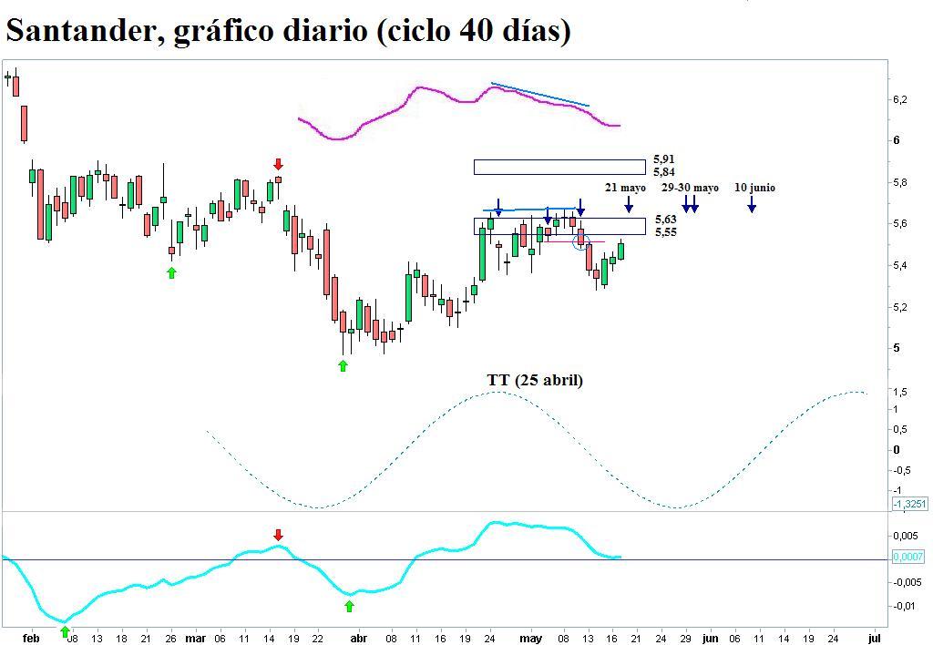 El indicador de momento, una vez más, anticipó al menos una fuerte caída al dibujar una clara divergencia bajista con el precio. No menos acertado fue el pronóstico de la onda sinusoidal, que preveía el techo teórico (TT) del ciclo para el día 25 de abril. Si bien es cierto que, pasado ese día, el Santander logró formar máximos crecientes el 8 de mayo, éstos fueron marginales, de modo que hay que dar por bueno el TT previsto en su momento. Asimismo, el desempeño de las vibraciones de Gann dejadas atrás ha resultado notable. La más exacta fue la fijada el día 10 de mayo, justo dos días antes del techo tras el cual comenzó una caída de cierta entidad. Aun así, por si el precio reforzase su ímpetu alcista advirtiéndonos de que quiere continuar a lomos de la fase ascendente del ciclo, he marcado en el gráfico las siguientes vibraciones con capacidad para forzar un techo.