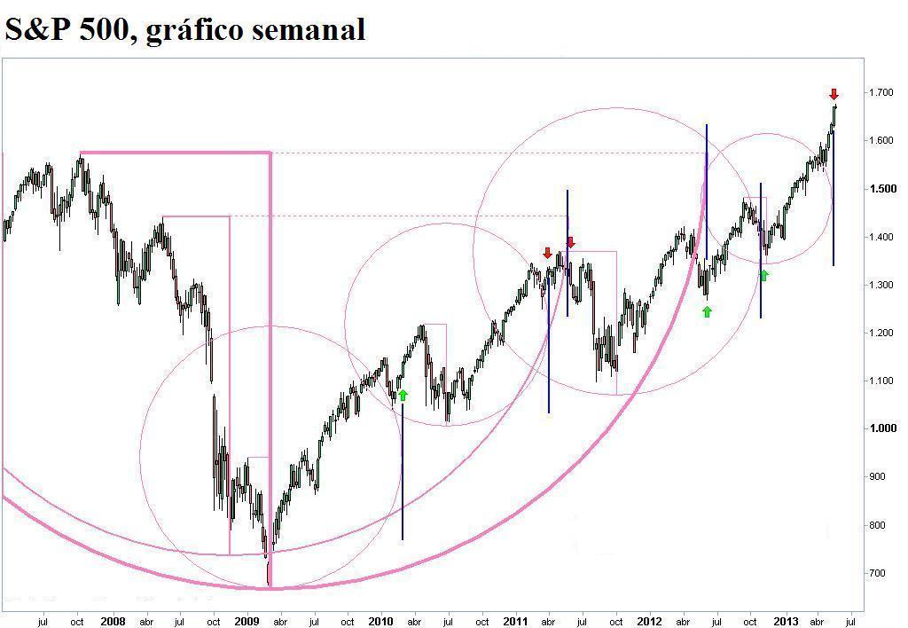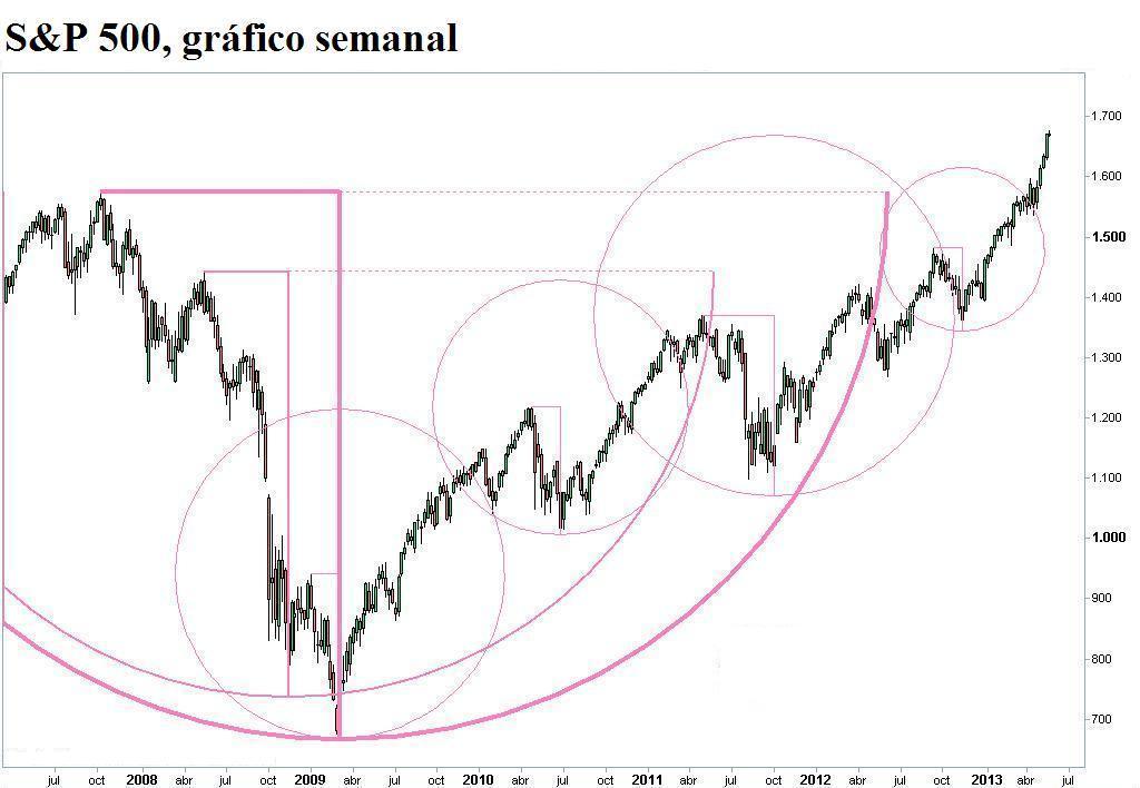 La otra forma de abordar el análisis de los gráficos con estas herramientas también participa de la clave de bóveda de la teoría cíclica de Gann: la idea de que tiempo y espacio son intercambiables. Siguiendo como campo de ensayo con el gráfico semanal del S&P 500, he tomado como punto de partida los máximos relevantes en el gráfico desde el máximo de 2007 (incluido éste), pero colocando el centro de dos arcos de circunferencia y el de una circunferencia completa en el punto donde cortan la línea horizontal proyectada desde esos máximos y la línea vertical que nace del mínimo de 2009. Con esos mimbres, repito, he trazado el arco inferior de dos circunferencias y una circunferencia entera. Después he realizado la misma operación en otras zonas del gráfico al punto de acabar dibujando tres circunferencias enteras adicionales.