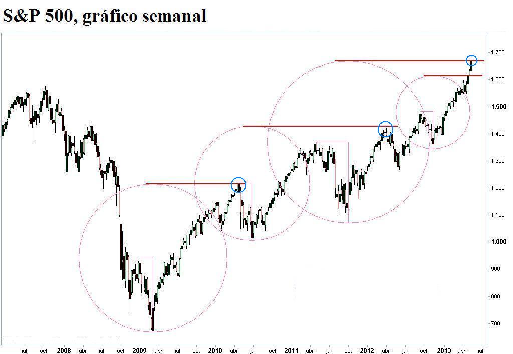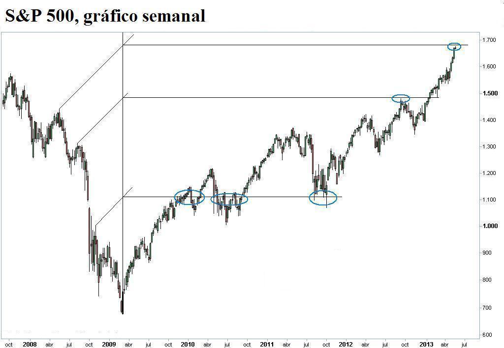 Por último, quiero mostrar una sencilla técnica que no tiene que ver con las figuras geométricas, pero que también resulta muy útil para encontrar futuras resistencias y soportes. En este caso la he empleado para determinar resistencias. Sólo con trazar ángulos de 45º desde anteriores techos del precio y ver dónde se cortan con la línea vertical que nace del mínimo de 2009, se encuentran zonas de potencial resistencia. Ahora mismo, el S&P 500 ha alcanzado una.