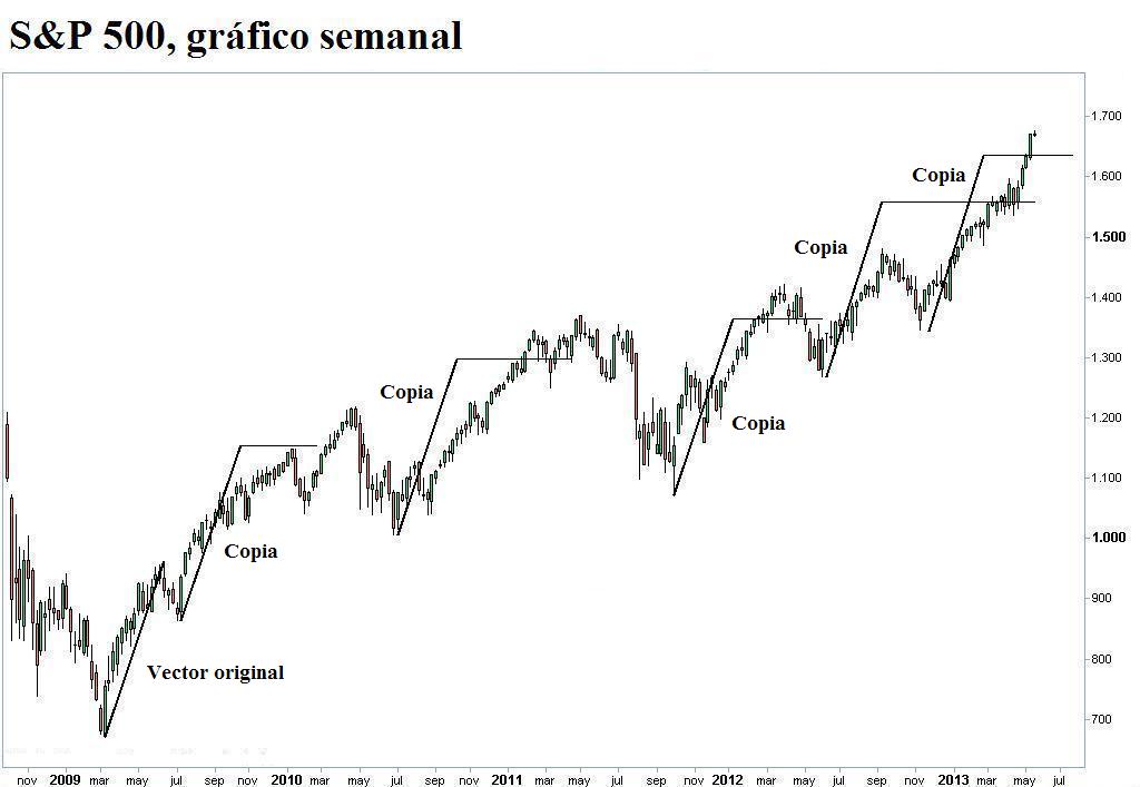Si tomamos como movimiento medido el vector creado por la subida experimentada por el S&P 500 desde marzo hasta julio de 2009 y lo proyectamos después desde cada mínimo relevante (los suelos de los ciclos de 40 semanas), puede observarse cómo el precio recorre aproximadamente la misma distancia en cada nuevo impulso alcista. La clave para entender este comportamiento predictivo del vector creado en el primer impulso alcista desde marzo de 2009 (suelo del actual ciclo de 4 años) es precisamente que ese mínimo de marzo fue el extremo del descomunal movimiento bajista del precio desde los máximos de 2007. Los grandes suelos y techos son a un tiempo movimientos extremos en términos de precio y tiempo. Esto implica que el primer impulso alcista generado desde un mínimo tan relevante como el de marzo de 2009 encierra un valor cíclico en sí mismo.