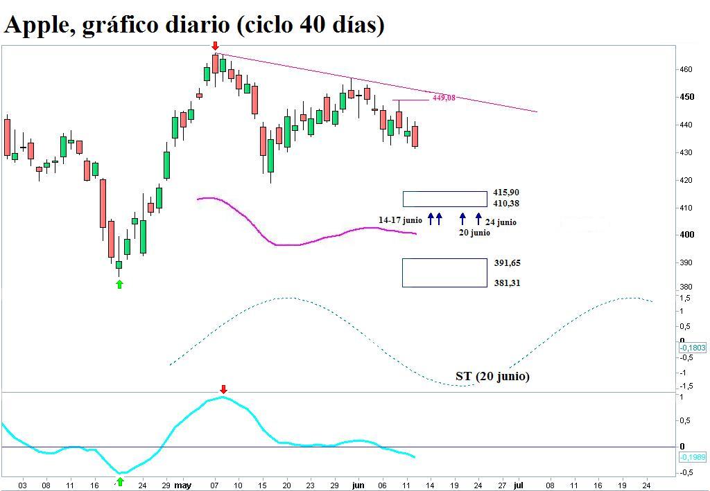 El indicador de momento, por ahora, no ofrece ninguna información relevante. Más información nos depara la onda sinusoidal, cuya expresión actual proyecta el suelo teórico (ST) del ciclo para el día 20 de junio. Asimismo, cuatro vibraciones de Gann abren una ventana de oportunidad para la formación de un suelo: las dos primeras aparecen los días 14 y 17 de junio; las dos siguientes están fijadas para los días 20 y 24 del mismo mes.