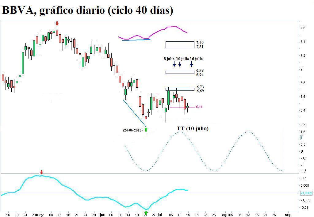 En ambas acciones se ha activado la señal de posible conclusión de la fase ascendente del ciclo al haberse roto sus respectivas líneas horizontales. A todo esto, me complace comprobar la precisión con que he podido pronosticar en los dos valores al menos un techo de cierto fuste gracias a las vibraciones de Gann y al techo teórico (TT) previsto por la onda sinusoidal para el 10 de julio.