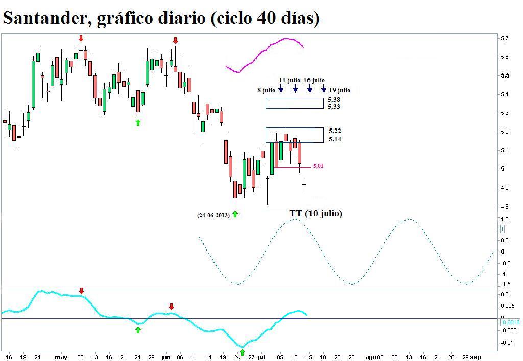 Afirmar que la situación técnica de los dos bancos está bastante deteriorada, no es necesario recordarlo. Eso sí, el deterioro resulta más profundo en el Santander. Una continuación de las caídas conduciría inevitablemente al cambio de fase. En tanto eso no ocurra, los movimientos de corto plazo a que podamos asistir estos próximos días responderán al ciclo de 10 días.